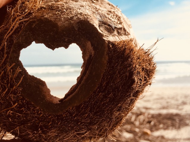 When we arrived at the beach, I found a coconut shell with a hole in the shape of a heart. I excitedly took several different photos of it.