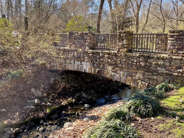 We headed to the Four Seasons Town Center for a little shopping. The mall had three floors connected by escalators and a glass elevator on a smallish footprint. This shopping area has not received the memo about the demise of the Anerican mall, as the store fronts were filled with the typical retail suspects anchored by JC Penney and Dillard’s. After snapping up a few bargains, we headed outdoors to enjoy the beautiful day. We followed Siri’s directions to locate Country Park, which was recommended online, but became sidetracked on the way as we approached Bicentennial Park with its flowers, trees, sculptures, bridges and mill.